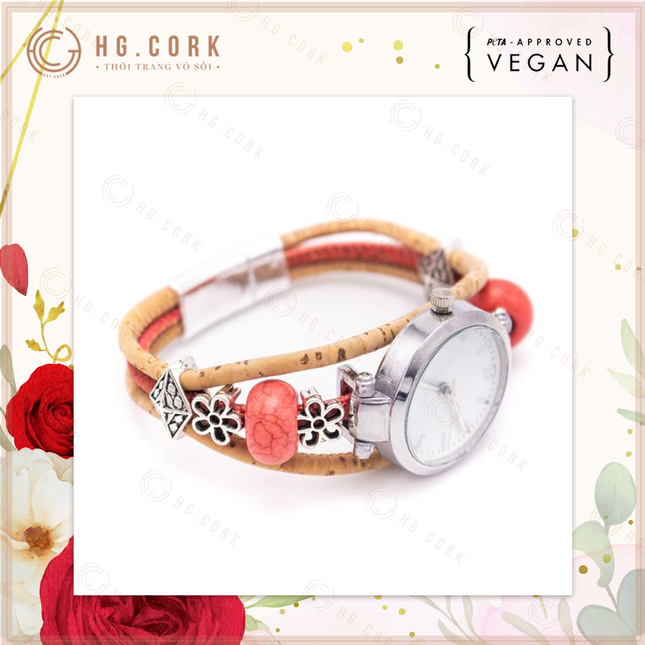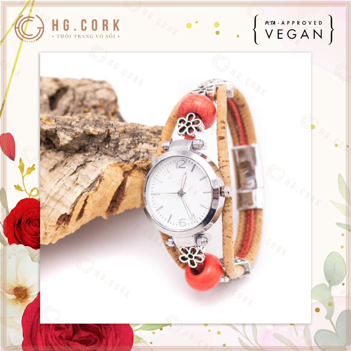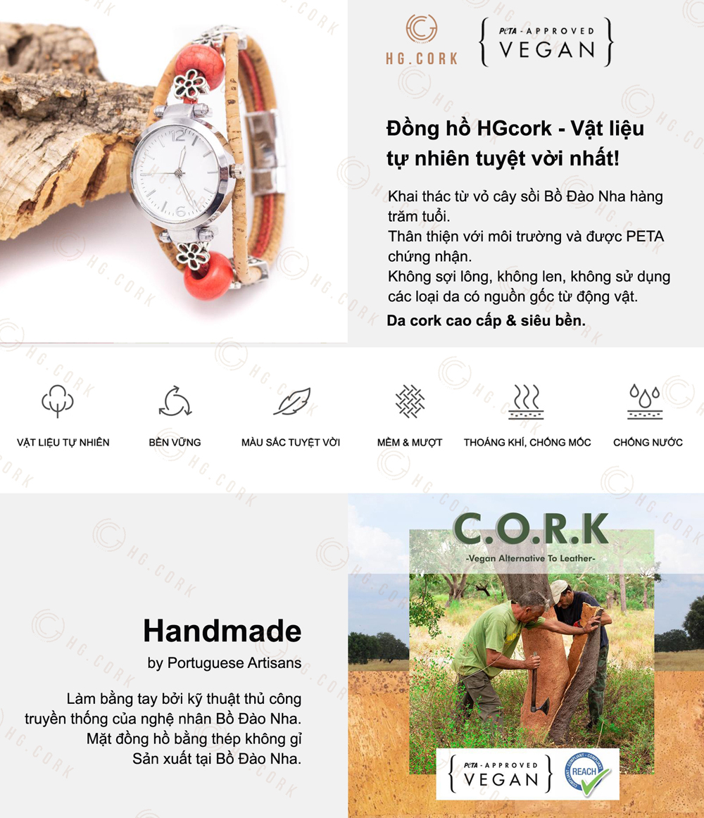 Đồng Hồ Nữ Thời Trang Bồ Đào Nha HGcork DH10 Dây Đeo Bằng Da Thực Vật (Cork/Lie) Dạng Vòng Tay Kèm Hạt Màu Đỏ