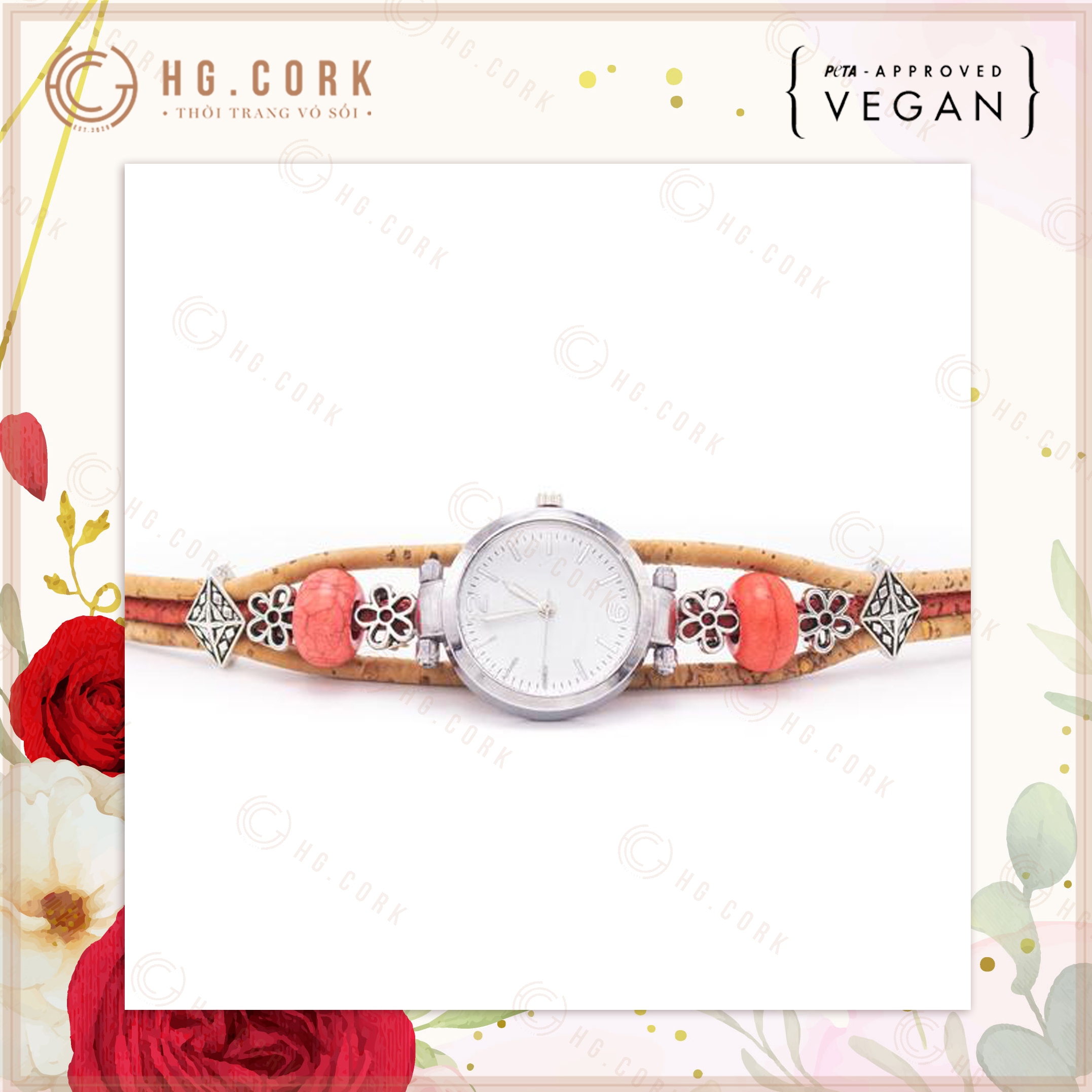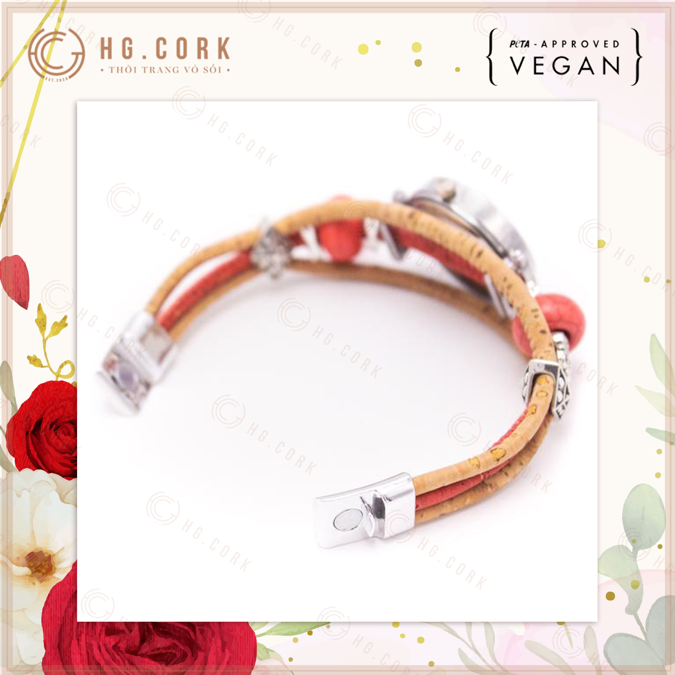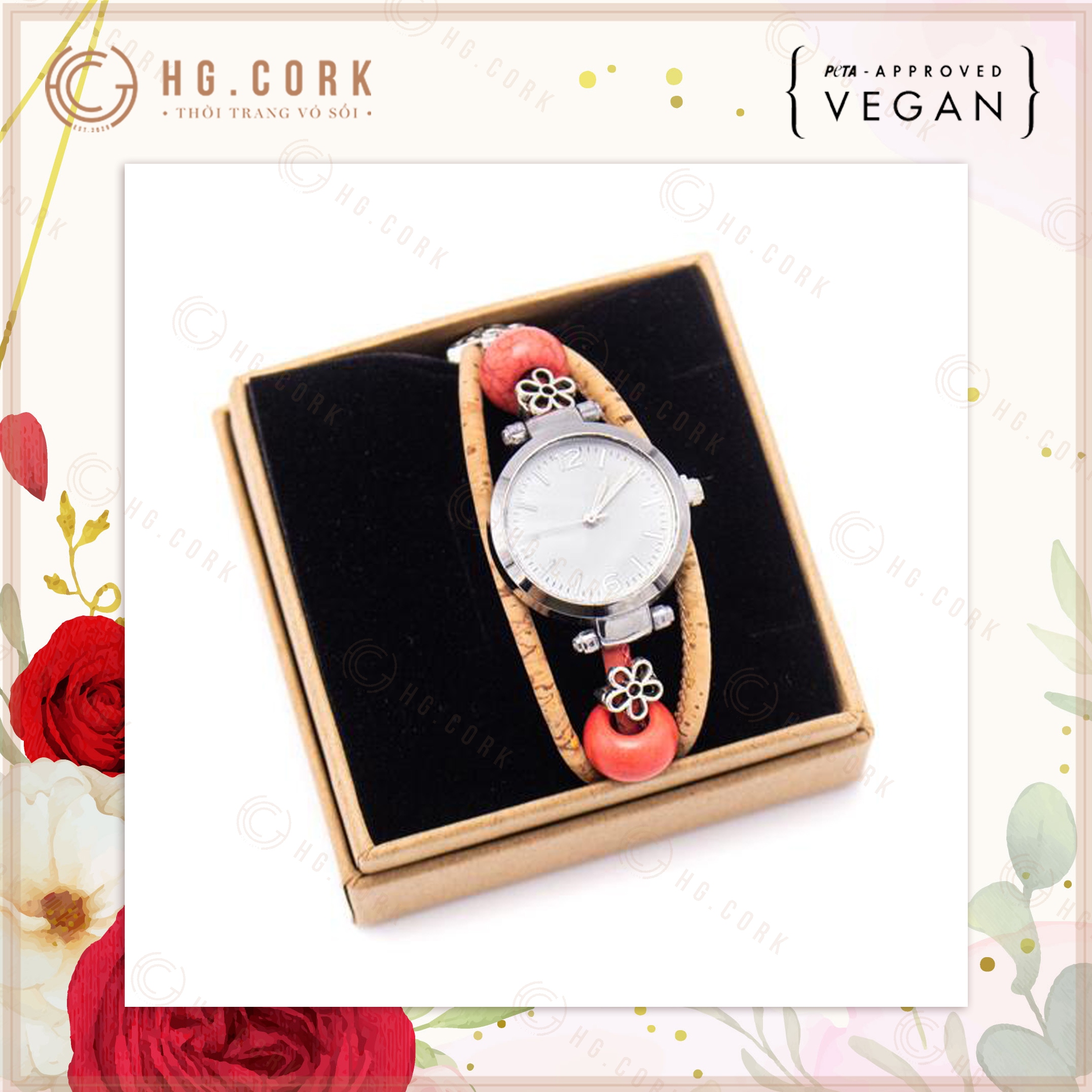 Đồng Hồ Nữ Thời Trang Bồ Đào Nha HGcork DH10 Dây Đeo Bằng Da Thực Vật (Cork/Lie) Dạng Vòng Tay Kèm Hạt Màu Đỏ