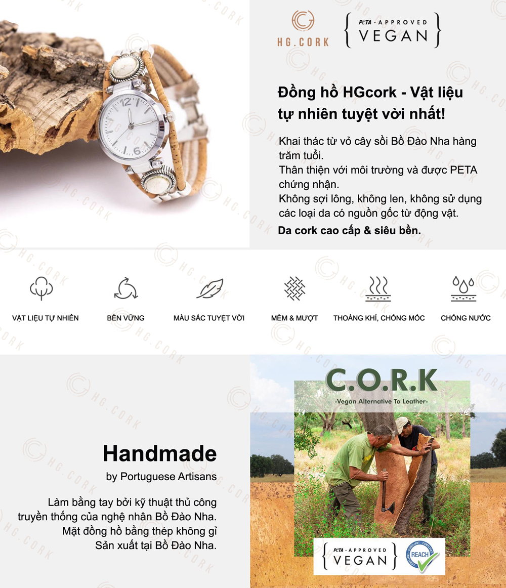 Đồng Hồ Nữ Thời Trang Bồ Đào Nha HGcork DH3 Dây Đeo Bằng Da Thực Vật (Cork/Lie)