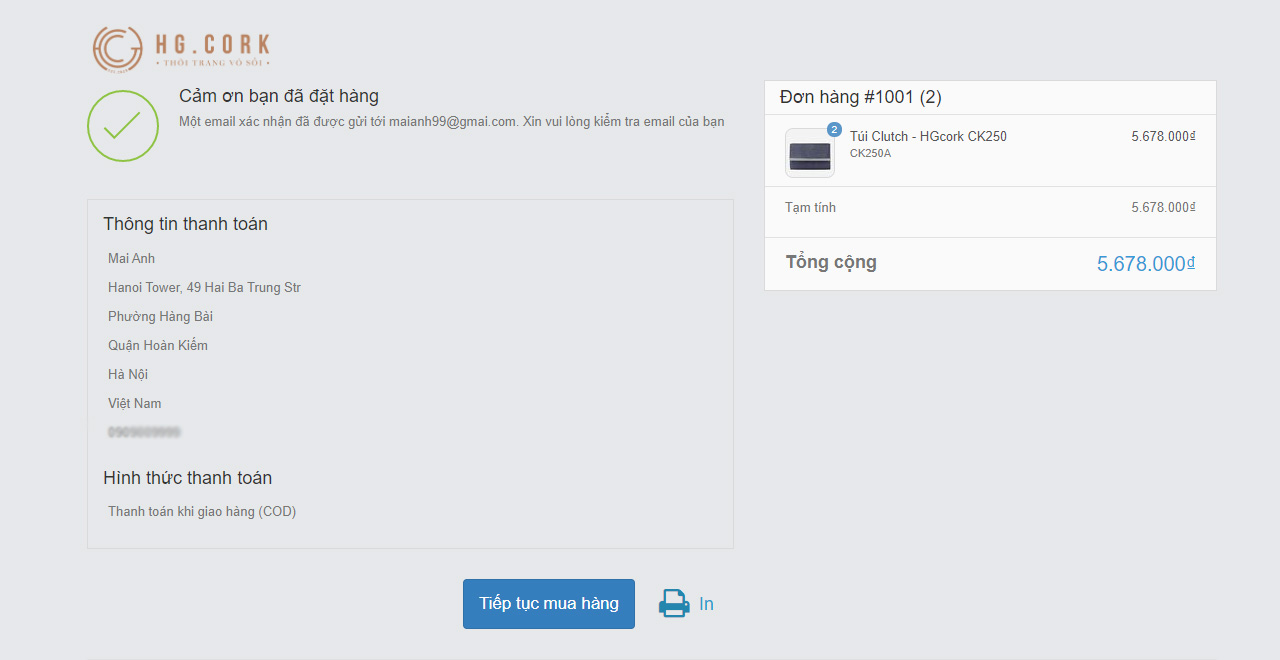 - Hệ thống sẽ gửi tự động một email xác nhận đơn hàng cho bạn vào địa chỉ mail bạn đã đăng ký.