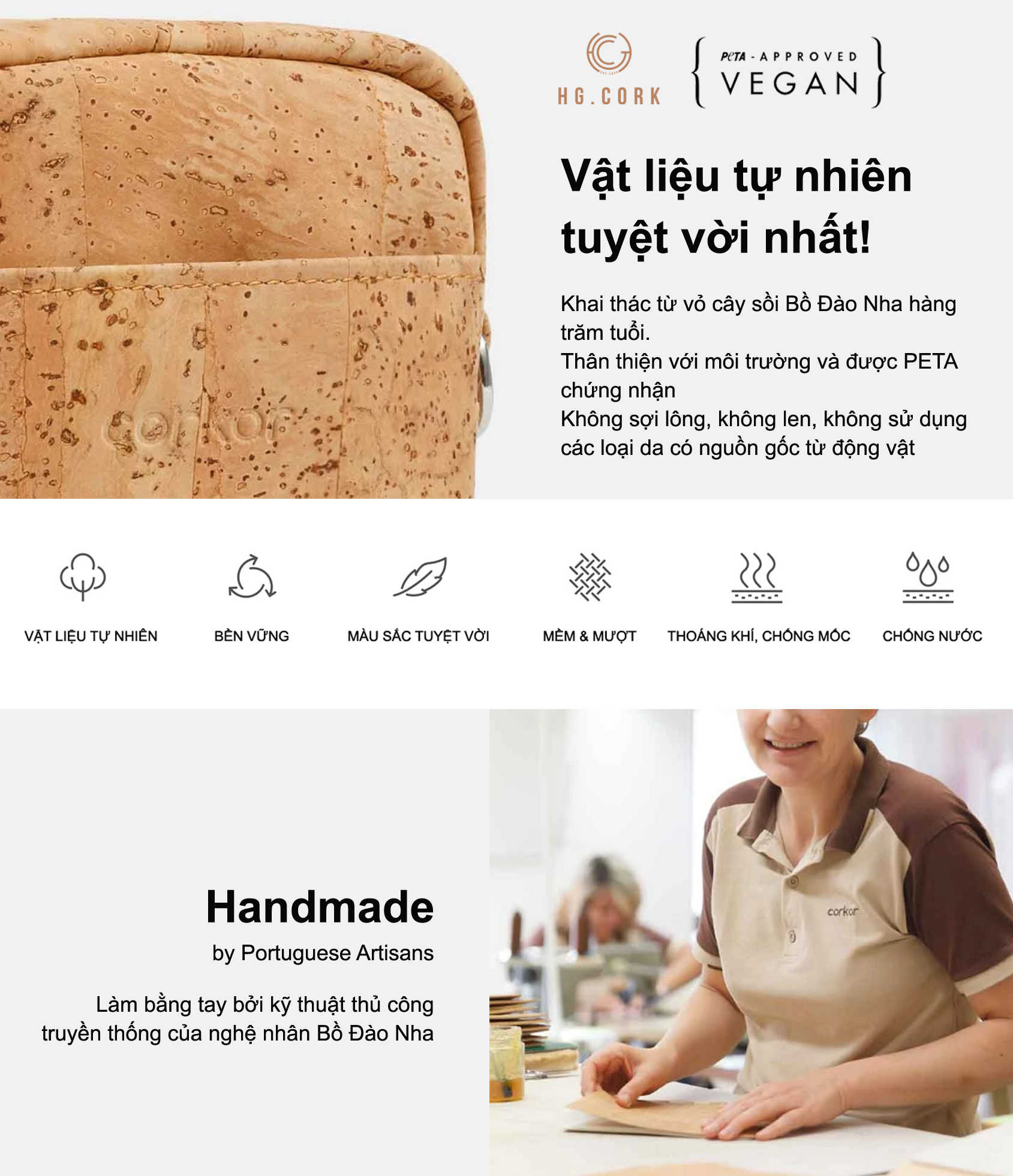 - Làm từ vỏ sồi cao cấp 43 năm tuổi, làm bằng tay bởi nghệ nhân Bồ Đào Nha