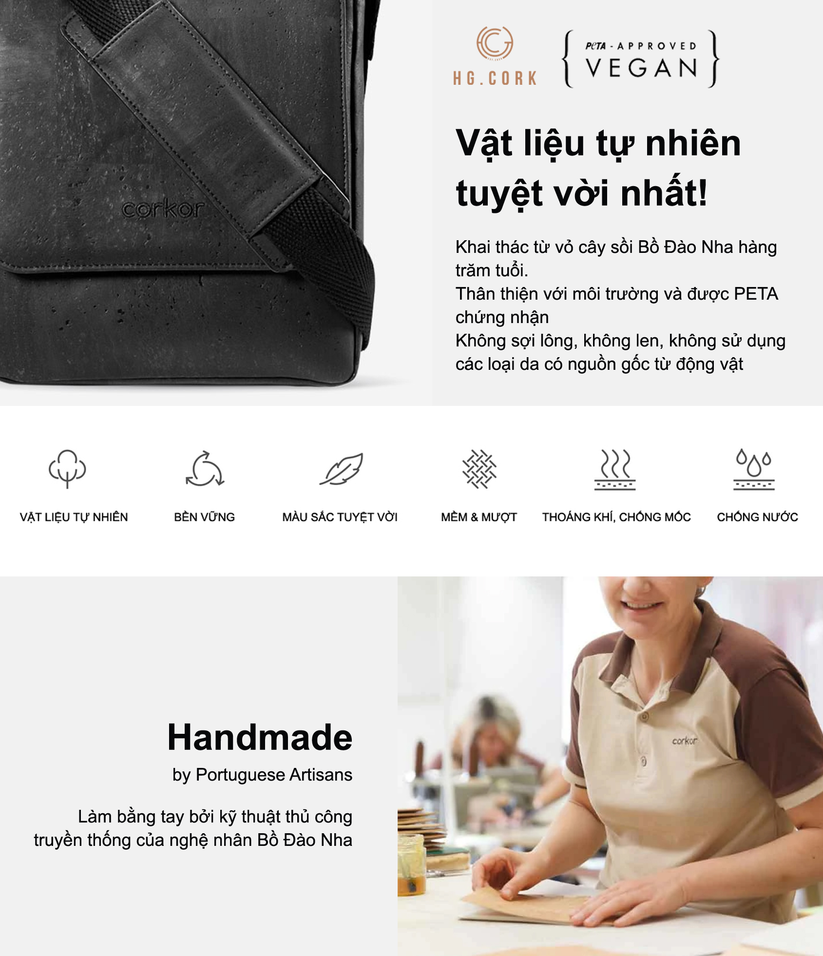 - Làm bằng vật liệu da cork cao cấp thuần chay, làm bằng tay bởi nghệ nhân Bồ Đào Nha.