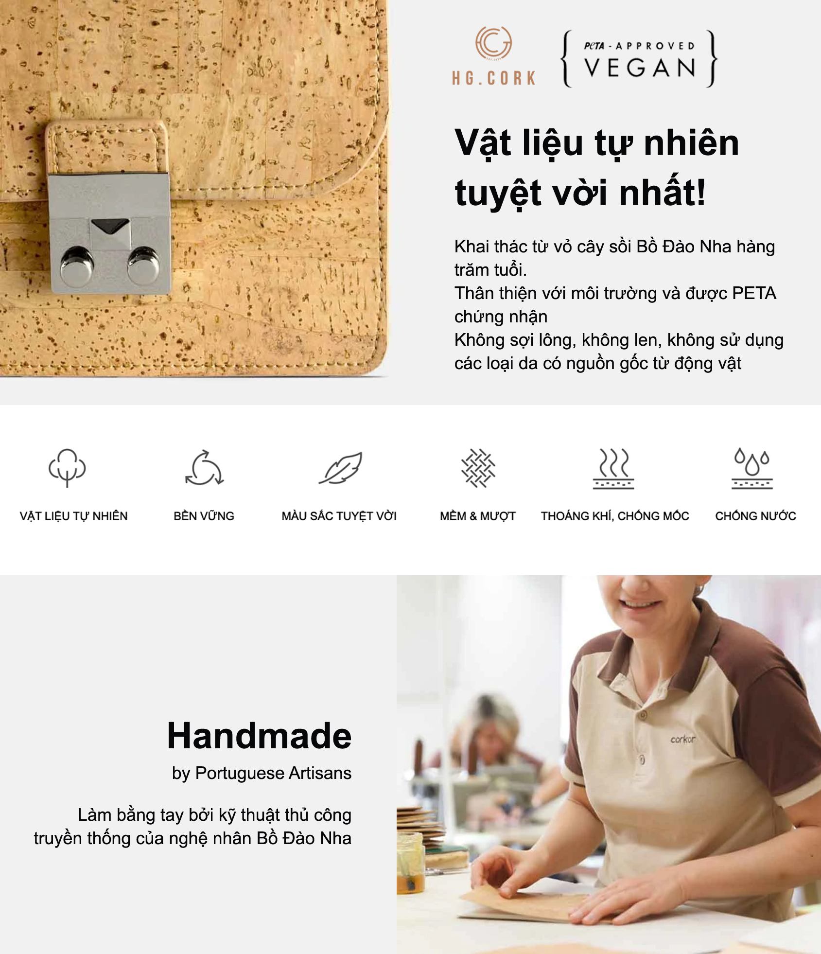 - Chất liệu: da cork cao cấp 100% thuần chay