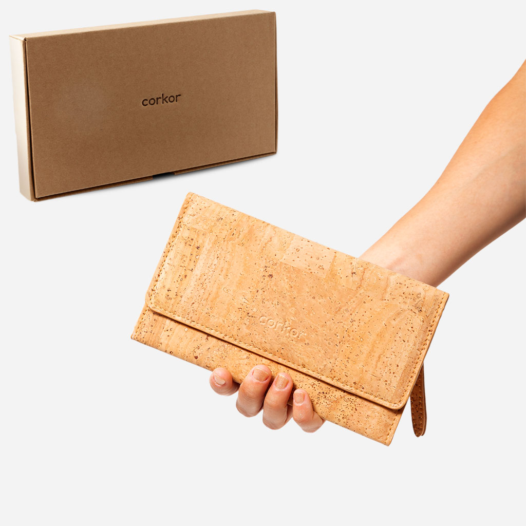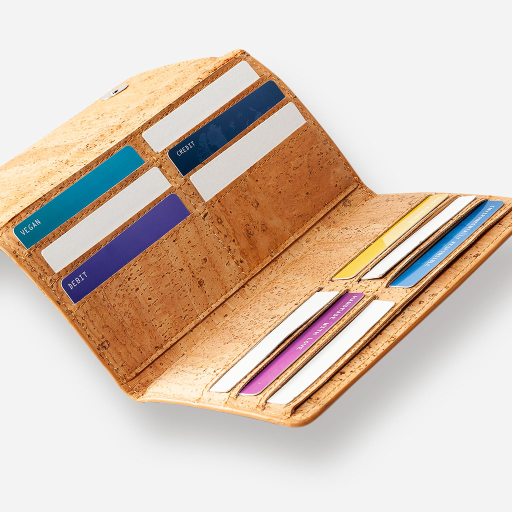 The slim cork wallet is a sleek vegan wallet cut from genuine cork. With a smart pocket interior, this piece will fit your cash, coins and up to 24 cards. Just slip it into your handbag to make your everyday life easier.